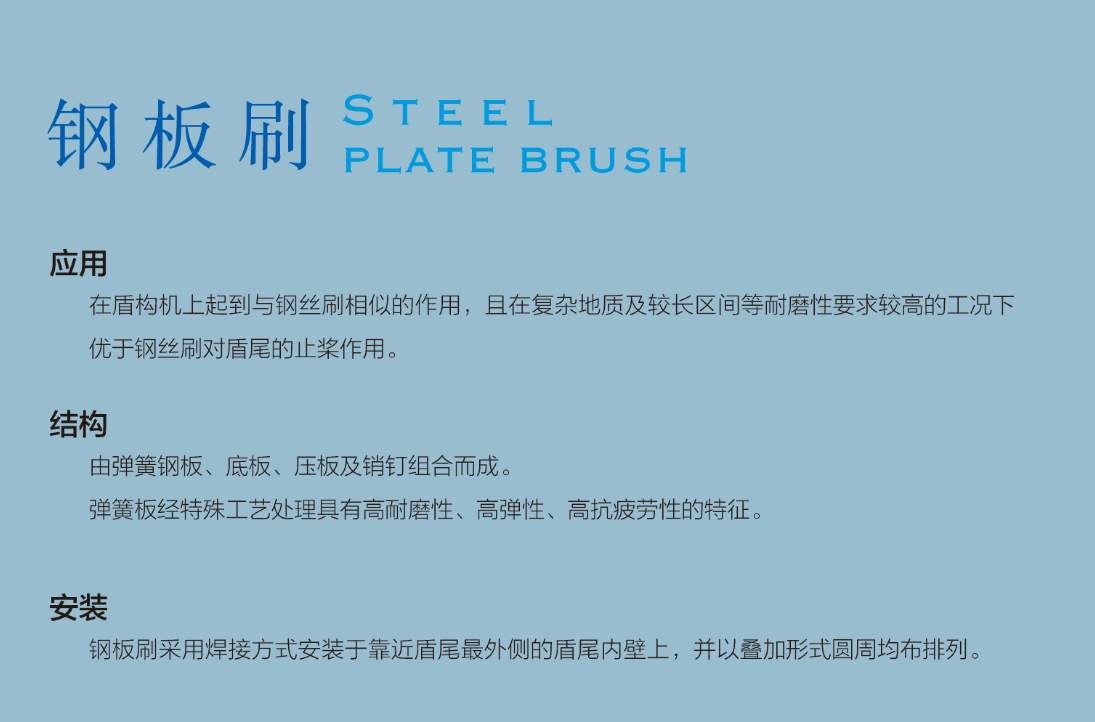 该产品主要应用于盾构机中,与标准版钢丝刷具有相似的作用,且在复杂地质及较长区间等耐磨性要求较高的工况下优于钢丝刷对盾尾的止浆作用。